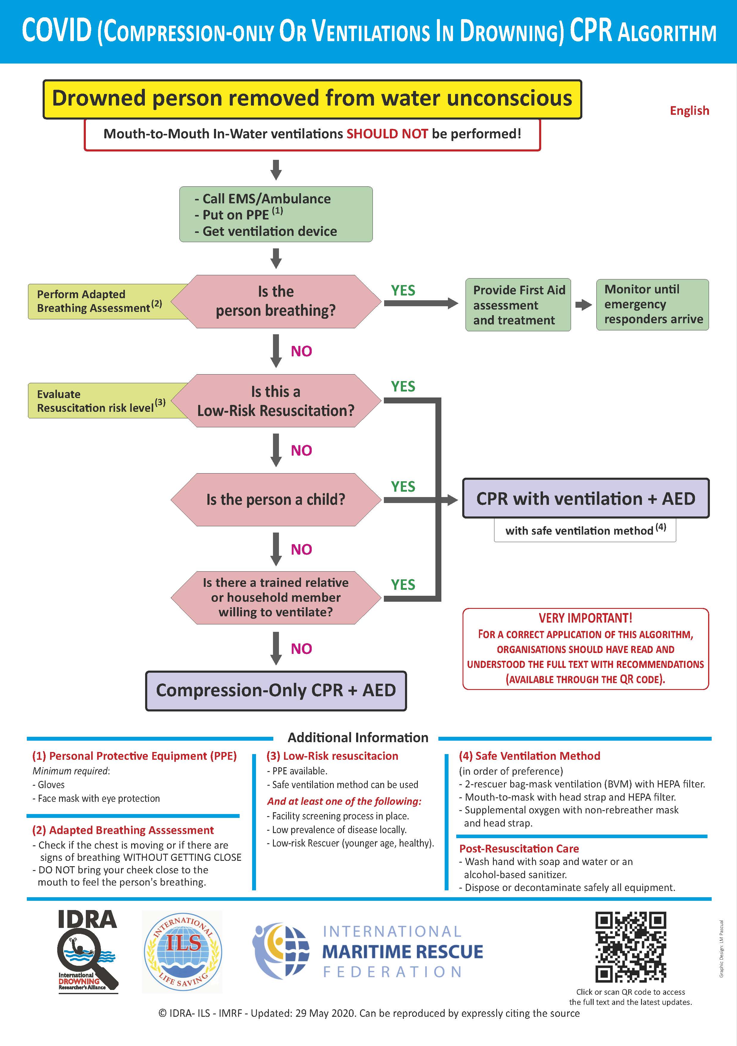 International Drowning Researchers’ Alliance [IDRA], have issued recommendations for CPR during the Covid-19 outbreak. The advice is demonstrated on a poster which is available here as a guide to first responders.